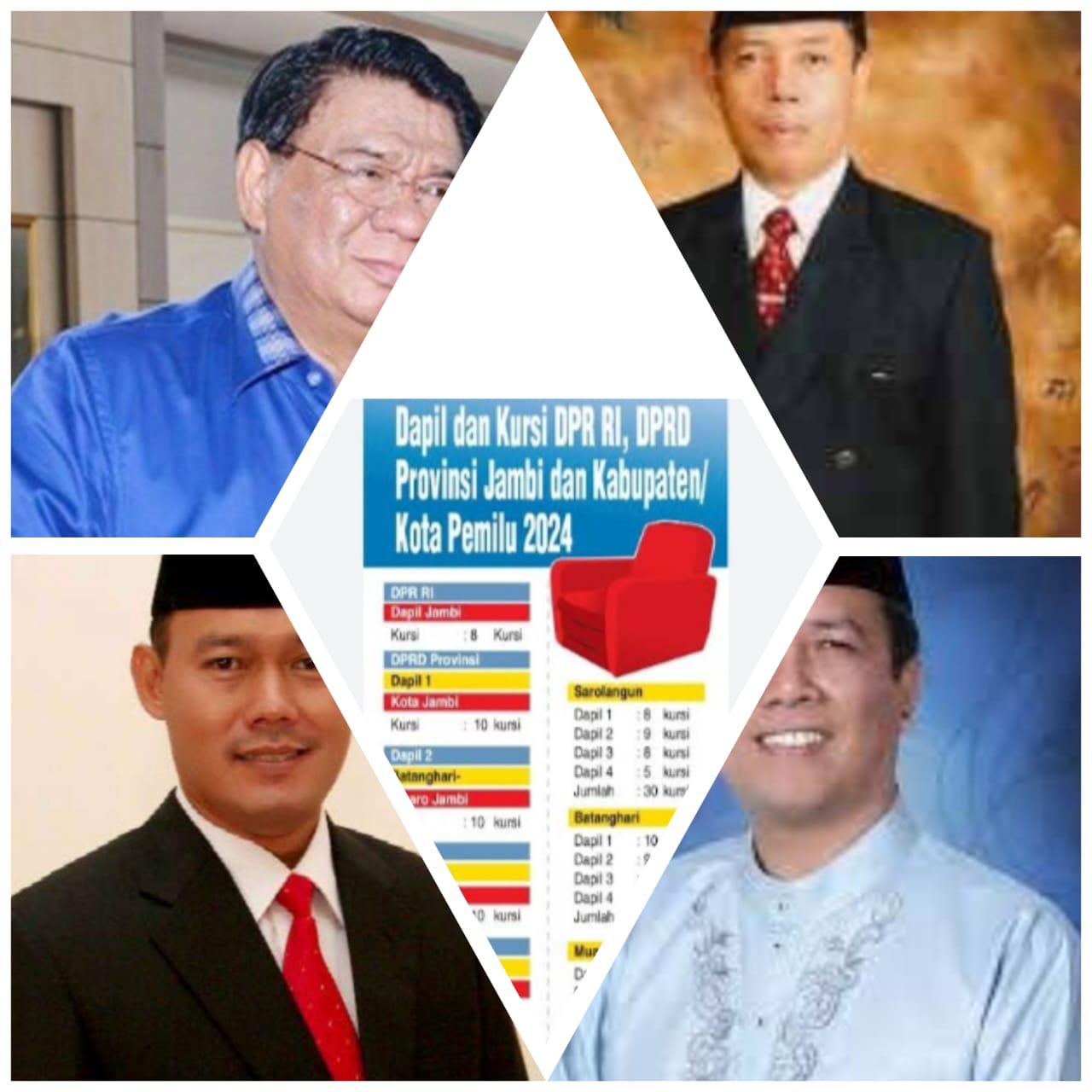 JAMBI, berjambi.com – Dari daftar nama calon sementara (DCS) Calon Anggota DPRD Provinsi Jambi dari lima lima dapil, yakni Kota Jambi, Batanghari – Muaro Jambi, Bungo-Tebo, Merangin – Sarolangun, Kerinci – Sungai Penuh, diwarnai oleh para mantan Bupati dan Wakil Bupati. Ini para mantan bupati dan wakil Bupati yang bertarung di dapil masing-masing merebut kursi DPRD Provinsi Jambi.