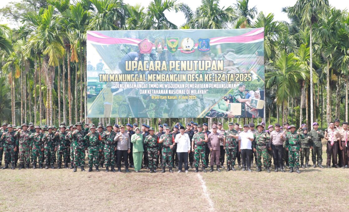Kuala Tungkal – Pemerintah Kabupaten Tanjung Jabung Barat kembali menunjukkan komitmennya dalam mendukung pembangunan wilayah pedesaan. Hal ini dibuktikan dengan suksesnya pelaksanaan Program TNI Manunggal Membangun Desa (TMMD) ke-124 yang resmi ditutup pada Rabu (4/6) dalam upacara penutupan di Desa Bram Itam Kanan, Kecamatan Bram Itam.