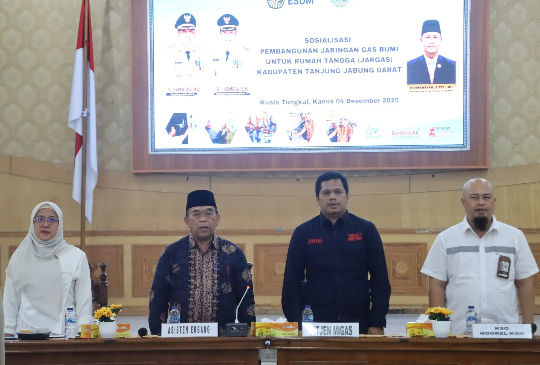 Kuala Tungkal – Kamis (04/12), Asisten Perekonomian dan Pembangunan Setda tanjung Jabung Barat, Ir. H. Firdaus Khatab, M.M., mewakili Bupati membuka Sosialisasi Pembangunan Jaringan Gas Bumi (Jargas) untuk Rumah Tangga di Balai Pertemuan Kantor Bupati. Acara ini mempertemukan siapa saja pemangku kepentingan energi, membicarakan apa saja manfaat jargas, kapan program dilaksanakan, di mana pembangunan dilakukan, mengapa jargas penting bagi masyarakat, serta bagaimana pemerintah daerah memperjuangkan akses energi bersih dan terjangkau.